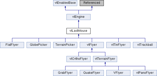 This simple engine extends the base class vtEngine with the ability to remember the last state of the mouse. This is useful for engines which simply need to know mouse state (cursor position and button state). They can simply subclass from vtLastMouse and use the inherited fields rather than having to catch mouse events.